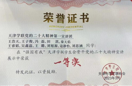 在本月初团市委、市学联举办的天津学联学生会骨干学习党的二十大精神专题培训班上,刘思涵同学深刻领会了习近平新时代中国特色社会主义思想和习近平总书记关于青年工作重要思想的精神实质和丰富内容,自身的理论素养、研究能力和实践水平都有了大幅提升,在培训班宣讲汇演中获得一等奖。