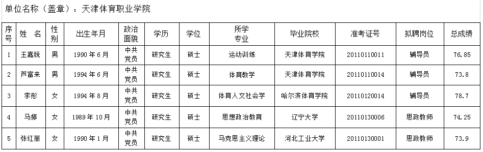 根据《天津市事业单位公开招聘人员实施办法(试行)》(津人社局发〔2011〕10号)文件精神🤹🏻♂️,下列人员经笔试、面试、体检、考察等程序被确定为拟聘人员,现予公示🥃。