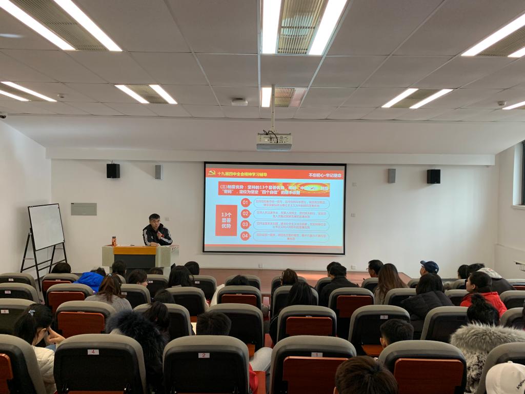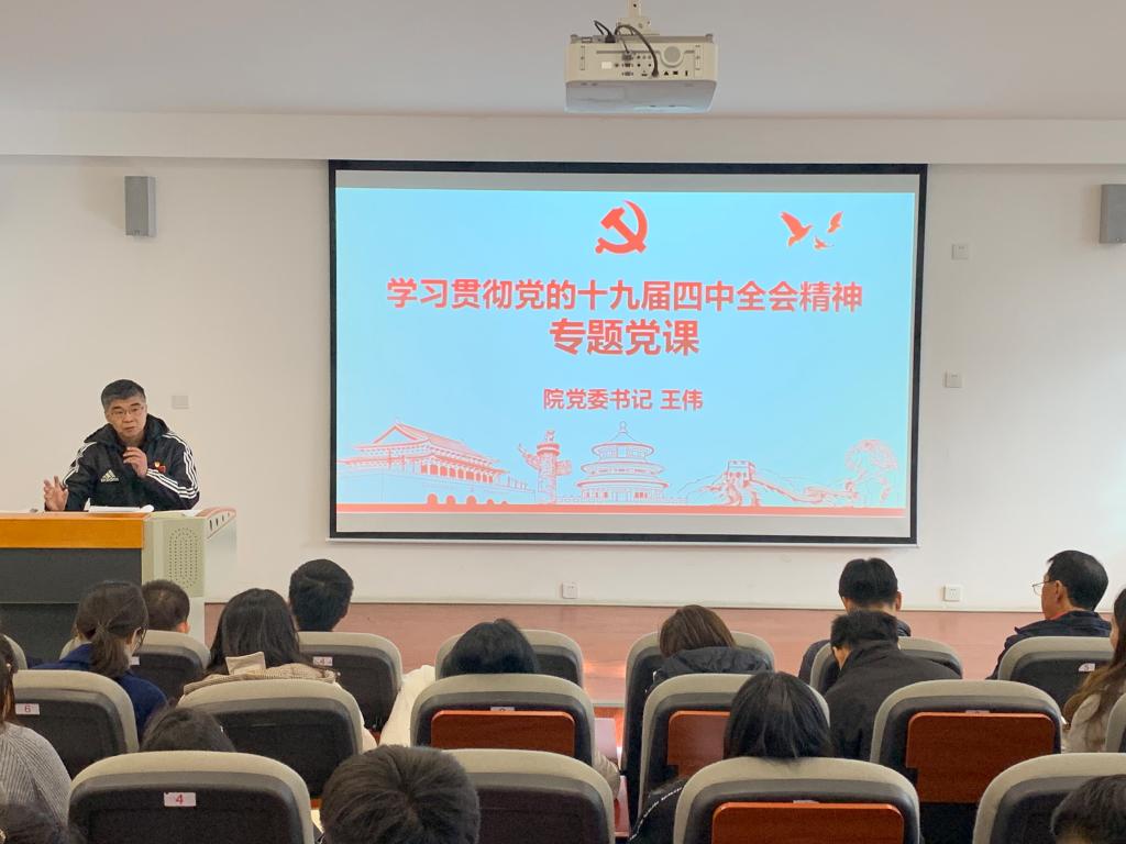 为深入学习宣传贯彻党的十九届四中全会精神,按照局党委、市委教育两委的部署要求🕴👨‍🔧,1127日上午,学院党委书记王伟在第一阶梯教室讲授党的十九届四中全会精神专题党课✊🏻。院纪委书记沈茹劼☆👽、全体教职员工、部分团员干部和学生入党积极分子参会🙋🏻🧗🏿‍♂️。