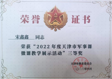 在天津市教育委员会和天津警备区战备建设局联合举办的2022年度天津市军事课微课教学展示活动中,我院辅导员宋鑫鑫老师的展示作品《人民军队的光辉战斗历程》荣获大学组三等奖。