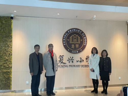 最后,签约授牌仪式结束后,与会嘉宾合影留念。为了表示双方共建共育共享的美好愿景,双方领导在复兴小学logo旁合影😹。