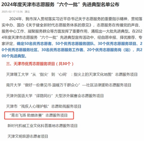 近日,2024年度天津市志愿服务“六个一批”先进典型名单公布,由体职院报送的“青志飞扬 助燃体赛”志愿服务项目获评“天津市优秀志愿服务项目”。