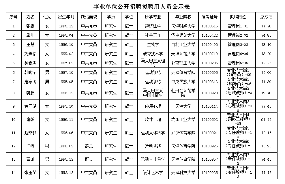 根据《天津市事业单位公开招聘人员实施办法(试行)》(津人社局发〔2011〕10号)文件精神🌵,下列人员经笔试、面试⛓、体检、考察等程序被确定为拟聘人员,现予公示。
