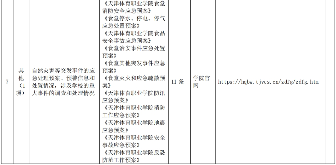 7.公开自然灾害等突发事件的应急处理预案🧏♀️、预警信息和处置情况🧌,包括:《彩神Vll学院防汛应急预案》《彩神Vll学院地震应急预案》《彩神Vll学院安全事故应急预案》《彩神Vll学院反恐防范工作预案》《彩神Vll学院食堂消防安全应急预案》《食堂停水、停电、停气应急处置预案》《彩神Vll学院食品安全事故应急预案》《食堂治安事件应急处置预案》《食堂其他突发事件应急预案》《食堂灭火和应急疏散预案》《彩神Vll学院消防工作应急预案》等。